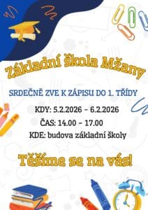 Vážení rodiče, zveme vás k zápisu do prvního ročníku základní školy Mžany pro školní rok 2026/2027.